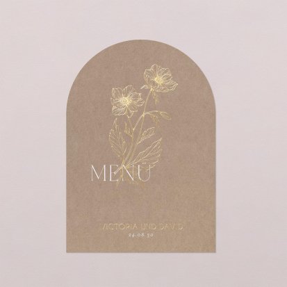 Paare schätzen die große Auswahl an Modellen und Gestaltungsmöglichkeiten unserer Menükarten für die Hochzeit. Ob rustikal, floral, orientalisch oder eine andere Stilrichtung – bei uns finden Ehepaare ganz bestimmt das Muster, das beiden gefällt. Für besonders stilvolle Menükarten bei der Hochzeit wählen sie Karten mit Gold-, Hochglanz-, Silber- oder Kupferveredelung.