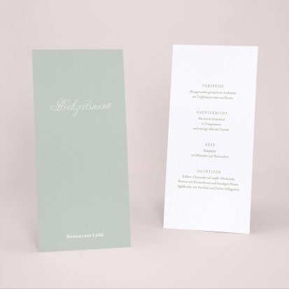 Ergänzen Sie die Deko auf den Hochzeitstischen auf bezaubernde Weise mit sorgfältig gestalteten Menükarten und sorgen Sie für Vorfreude auf das Hochzeitsmenü!