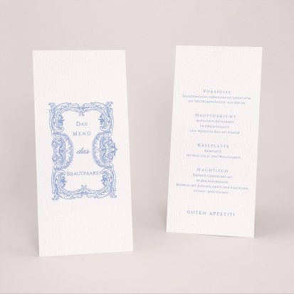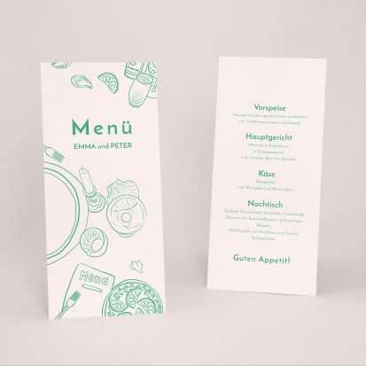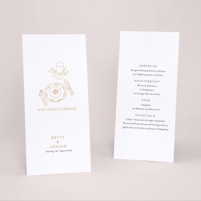 Ein Tipp von unseren Mitarbeitern: Wenn Sie sich für eine Menükarte entschieden haben, sehen Sie auf der Produktseite unter dem Artikelbild weitere Produkte im gleichen Design. Lassen Sie sich davon inspirieren und machen Sie aus Ihrer Hochzeit ein unvergessliches Ereignis mit wunderschön stimmigen Erinnerungsfotos.