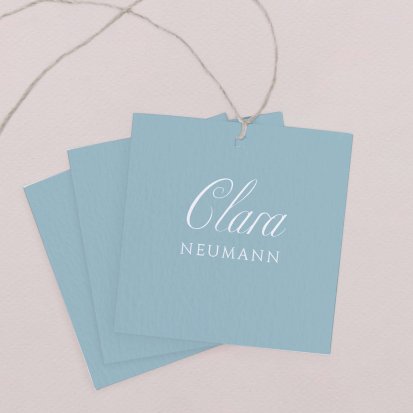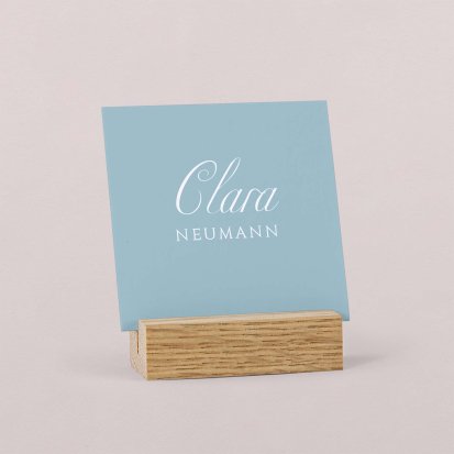 Die Beschriftung enthält den Vor- und Nachnamen eines jeden Gastes. Bei Feierlichkeiten mit wenigen Gästen genügt es, sich auf den Vornamen zu beschränken, um die familiäre Stimmung zu unterstreichen. Zwei verschiedene Schriften, welche je den Vornamen und Nachnamen hervorheben, verleihen dem Design von Namenskarten ein aufgelockertes Gesamtbild.