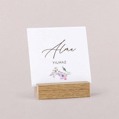 Die Beschriftung enthält den Vor- und Nachnamen eines jeden Gastes. Bei Feierlichkeiten mit wenigen Gästen genügt es, sich auf den Vornamen zu beschränken, um die familiäre Stimmung zu unterstreichen. Zwei verschiedene Schriften, welche je den Vornamen und Nachnamen hervorheben, verleihen dem Design von Namenskarten ein aufgelockertes Gesamtbild.