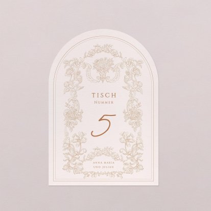 Sobald Sie die passende Vorlage für sich gefunden haben, können Sie auch schon mit der individuellen Gestaltung Ihrer Tischnummern für die Hochzeit beginnen. Jetzt folgt der kreative Teil! Sie können nun unter anderem die Schriftart, -größe und -farbe für die Nummern festlegen und weitere kleine Deko-Elemente in Form von Texten oder Bildern hinzufügen. Auch die Anpassung der eventuell gewählten Gold-, Silber- oder Kupferelement wird in diesem Schritt vorgenommen. Sie können beliebig viele Varianten ausprobieren, bis Sie absolut zufrieden sind. Testen Sie beispielsweise, ob Ihnen die Tischnummern besser gefallen, wenn Sie das Hochzeitsdatum und Ihre Namen mit aufschreiben oder ob Ihnen das zu viel wird. Vielleicht ist aber auch das Gegenteil der Fall und Sie möchten zusätzlich noch einen lieben Spruch, ein Foto oder Herzen, Tauben oder andere kleine Bildchen ergänzen. Probieren Sie sich gerne aus! Beachten Sie dabei nur, dass die Tischnummer gut lesbar bleibt – und demnach am besten großgeschrieben und kaum durch Zierelemente verdeckt sein sollte.