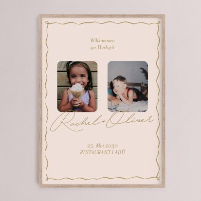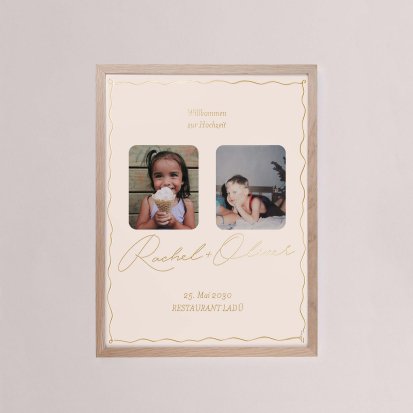 Sie haben die passende Vorlage gewählt und bereits erste Personalisierungen in Form von Größenwahl, Gestaltung des Rahmens und der Entscheidung darüber, ob Sie Ihr Schild mit Gold- oder Kupferelementen verzieren wollen, vorgenommen. Nun kommt der künstlerische Teil, bei dem Sie das Willkommensschild zur Hochzeit bis ins letzte Detail individualisieren können – damit es perfekt zu Ihnen und Ihrem besonderen Tag passt. Sie können im Bearbeitungstool beispielsweise Ihre Namen und Ihr Hochzeitsdatum einfügen. Außerdem haben Sie die Möglichkeit, weitere Text- oder Bildelemente zu ergänzen, ganz nach Ihrem Geschmack. Wie wäre es mit einem passenden Zitat, Bildern von Ihrer ersten Zeit als Paar oder auch einem kleinen Gruß an Ihre Gäste? Wenn Sie Ihr Willkommensschild zur Hochzeit gleichzeitig auch als ersten Wegweiser nutzen wollen, können Sie jetzt einen skizzenhaften Lageplan einfügen oder in wenigen Worten beschreiben, was wo zu finden sein wird. Probieren Sie gerne verschiedene Designs aus, bis Sie rundum mit ihrem personalisierten Hochzeitsschild zufrieden sind.
