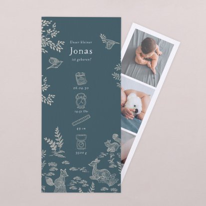 Geburtskarten für Jungen finden Sie auf Cotton Bird in vielfältigen Varianten durch die einfache Filterfunktion. Eine oft gewählte Variante ist das Design “Skizze-Natur”. Die moderne Karte im Hochformat besticht mit angesagtem Kraft-Papier und Fotostreifen zum Einstecken. So können Sie all Ihre Lieben mit Babys ersten Schnappschüssen überraschen. Zusätzlich können Sie Ihre Karten mit individuellem Text versehen.