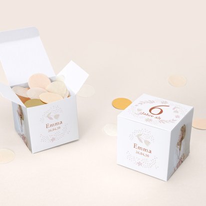 Wenn es zum Zeitpunkt der Feier nicht zu warm draußen ist, können Sie die Box natürlich auch mit Gummibärchen oder Schokolade füllen. Auch diese Süßigkeiten sind ein beliebtes Gastgeschenk – übrigens nicht nur beim Kindergeburtstag, sondern auch bei Hochzeiten, Taufen oder der Kommunion oder Konfirmation.