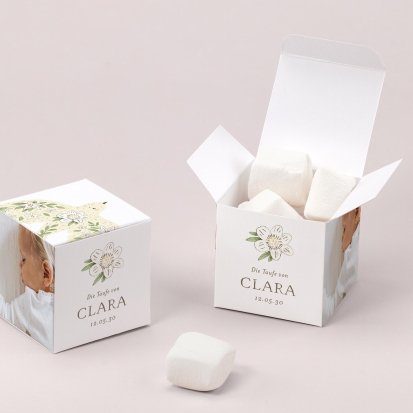 Füllen Sie die Geschenkbox mit dragierten Mandeln, Macaros oder Bonbons als kleines Dankeschön für Ihre Taufgäste.