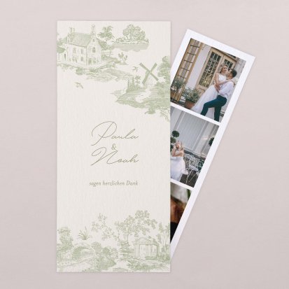 Für ein besonders persönliches Dankeschön sorgen Sie mit Dankeskarten mit Hochzeitsfotos – entweder mit Fotos von sich und Ihrem Partner bei der Trauung, von besonderen Momenten während der Feier oder ganz speziell mit Fotos vom jeweiligen Gast, bei dem Sie sich bedanken wollen. Je nach gewählter Vorlage haben Sie dabei nicht nur die Möglichkeit, ein Foto auf die Karte drucken zu lassen, sondern zusätzlich noch einen Fotostreifen mit bis zu drei weiteren Bildern beizulegen.
