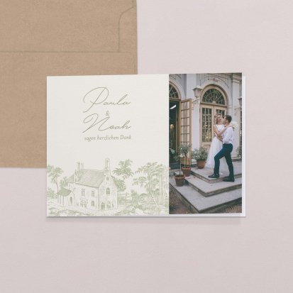 Mit einer personalisierten Dankeskarte zeigen Sie Ihren Hochzeitsgästen noch einmal, wie sehr Sie sich über deren Anwesenheit gefreut haben. Die Danksagungskarten für Hochzeiten sind ein runder Abschluss eines bedeutsamen Tages – und damit sich diese auch perfekt auf Ihre Hochzeitspapeterie abstimmen lassen, steht Ihnen eine riesige Auswahl an Design-Vorlagen zur Verfügung. Diese können Sie zusätzlich personalisieren, beispielsweise mit einem schönen Foto von der Feier.