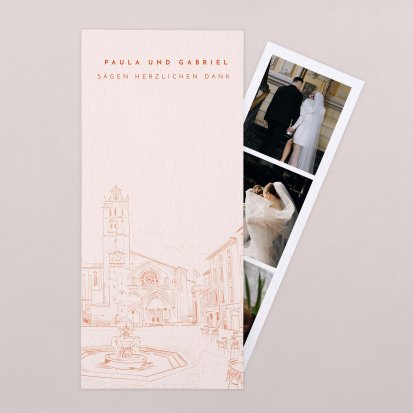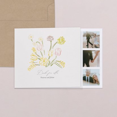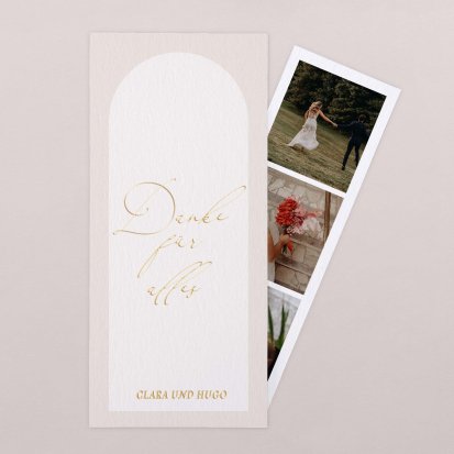 Für ein besonders persönliches Dankeschön sorgen Sie mit Dankeskarten mit Hochzeitsfotos – entweder mit Fotos von sich und Ihrem Partner bei der Trauung, von besonderen Momenten während der Feier oder ganz speziell mit Fotos vom jeweiligen Gast, bei dem Sie sich bedanken wollen. Je nach gewählter Vorlage haben Sie dabei nicht nur die Möglichkeit, ein Foto auf die Karte drucken zu lassen, sondern zusätzlich noch einen Fotostreifen mit bis zu drei weiteren Bildern beizulegen.