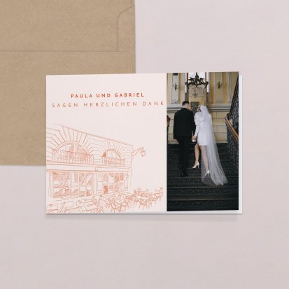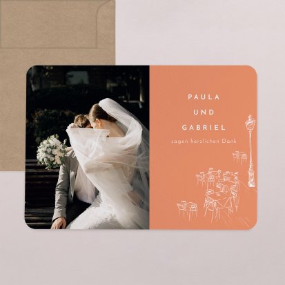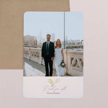 Mit einer personalisierten Dankeskarte zeigen Sie Ihren Hochzeitsgästen noch einmal, wie sehr Sie sich über deren Anwesenheit gefreut haben. Die Danksagungskarten für Hochzeiten sind ein runder Abschluss eines bedeutsamen Tages – und damit sich diese auch perfekt auf Ihre Hochzeitspapeterie abstimmen lassen, steht Ihnen eine riesige Auswahl an Design-Vorlagen zur Verfügung. Diese können Sie zusätzlich personalisieren, beispielsweise mit einem schönen Foto von der Feier.