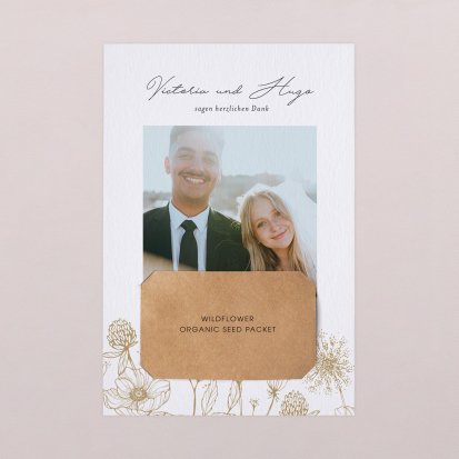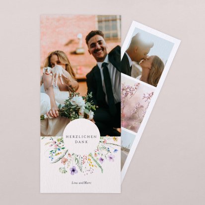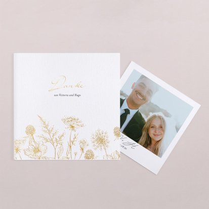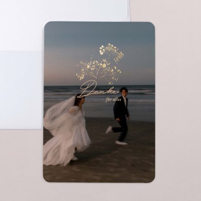 Mit einer personalisierten Dankeskarte zeigen Sie Ihren Hochzeitsgästen noch einmal, wie sehr Sie sich über deren Anwesenheit gefreut haben. Die Danksagungskarten für Hochzeiten sind ein runder Abschluss eines bedeutsamen Tages – und damit sich diese auch perfekt auf Ihre Hochzeitspapeterie abstimmen lassen, steht Ihnen eine riesige Auswahl an Design-Vorlagen zur Verfügung. Diese können Sie zusätzlich personalisieren, beispielsweise mit einem schönen Foto von der Feier.