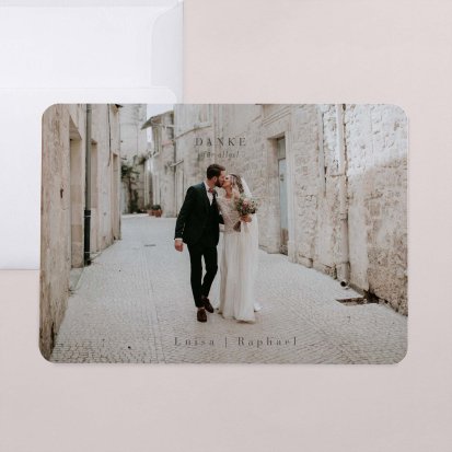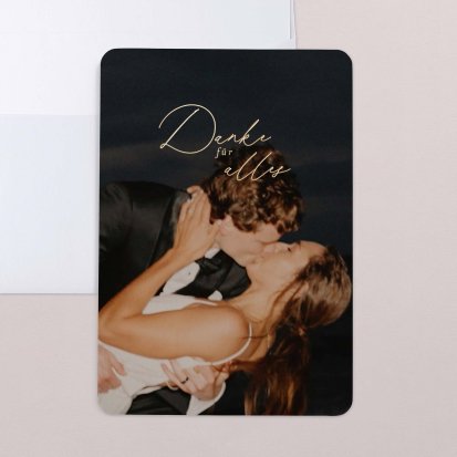 Mit einer personalisierten Dankeskarte zeigen Sie Ihren Hochzeitsgästen noch einmal, wie sehr Sie sich über deren Anwesenheit gefreut haben. Die Danksagungskarten für Hochzeiten sind ein runder Abschluss eines bedeutsamen Tages – und damit sich diese auch perfekt auf Ihre Hochzeitspapeterie abstimmen lassen, steht Ihnen eine riesige Auswahl an Design-Vorlagen zur Verfügung. Diese können Sie zusätzlich personalisieren, beispielsweise mit einem schönen Foto von der Feier.