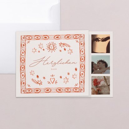Für ein besonders persönliches Dankeschön sorgen Sie mit Dankeskarten mit Hochzeitsfotos – entweder mit Fotos von sich und Ihrem Partner bei der Trauung, von besonderen Momenten während der Feier oder ganz speziell mit Fotos vom jeweiligen Gast, bei dem Sie sich bedanken wollen. Je nach gewählter Vorlage haben Sie dabei nicht nur die Möglichkeit, ein Foto auf die Karte drucken zu lassen, sondern zusätzlich noch einen Fotostreifen mit bis zu drei weiteren Bildern beizulegen.
