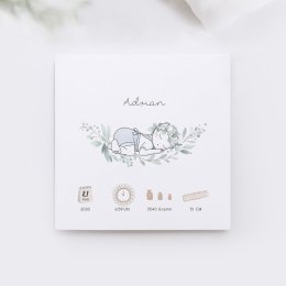 Ein friedlich schlafendes Baby wird sanft von einem Eukalyptuszweig geschaukelt. Mit dieser liebevollen Darstellung eignet sich das Modell Engelchen perfekt, um die Geburt Ihres Babys auf gefühlvolle Weise bekannt zu geben.
