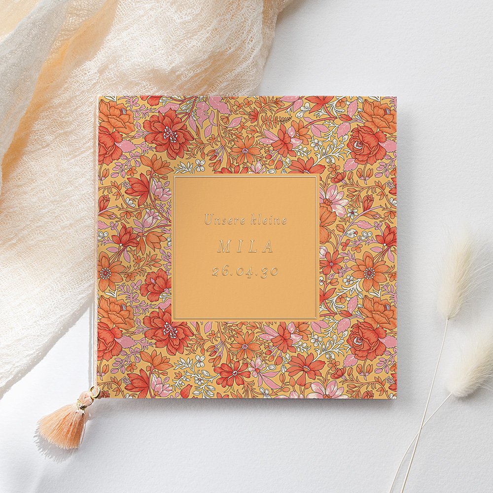 Auf der Geburtskarte Dahlias rahmt ein ausgefallenes Blumenmuster in Pink und Gelbtönen das Foto Ihre Babys. Der Name Ihres kleinen Sonnenscheins erstrahlt in glänzendem Gold und sorgt so für extra Eleganz und Wärme.