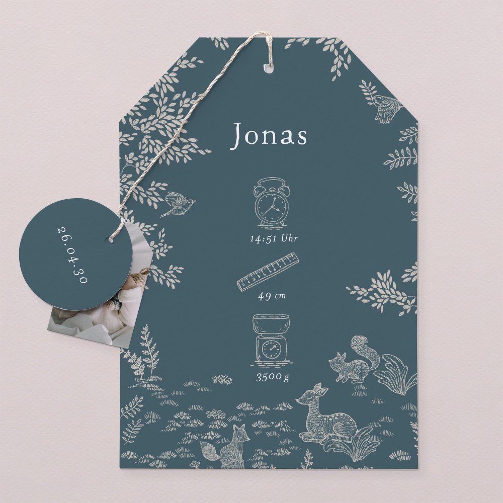 Diese Geburtskarte im originellen Format lässt sich auf der Vorder- und Rückseite mit Ihren Fotos und Ihrem Text gestalten. Auch die zwei kleinen Anhänger lassen sich personalisieren.