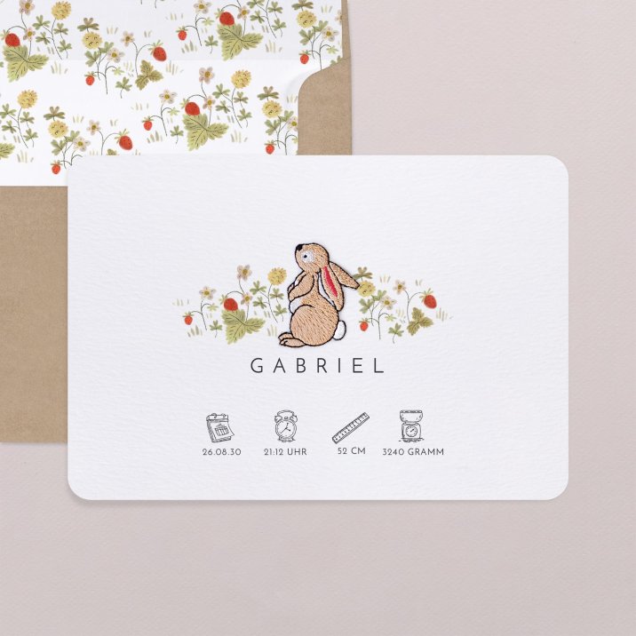 Wir freuen uns, Ihnen unsere Geburtskarten mit gesticktem Aufnäher zu präsentieren - eine originelle und exklusive Kreation aus unserem Atelier! Teilen Sie Ihr Glück auf die süßeste Art und Weise mit einer Karte, die mit einem niedlichen Accessoire in Form eines Kuscheltieres oder Waldtiers gespickt ist und einen Hauch von Retro-Feeling versprüht. Auf der Geburtskarte Erdbeerfeld überbringt ein kleiner Hase die frohe Botschaft von der Geburt Ihres Kindes inklusive den wichtigsten Angaben (wie Größe und Gewicht) zu diesem besonderen Ereignis. Diese Karte mit liebevollen Details werden Ihre Liebsten sicher gerne als Andenken aufbewahren!