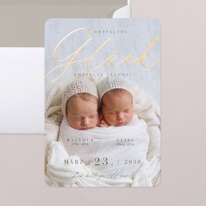 Schlicht und schön - diese große Geburtskarte im Hochformat hat sanft abgerundete Ecken und ist beidseitig personalisierbar.