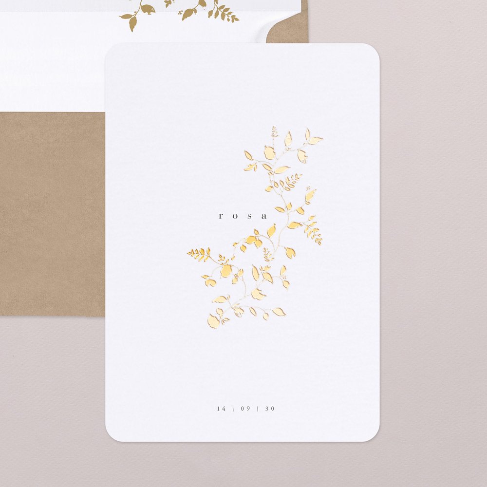 Eine minimalistische Babykarte mit zarter Gold-Veredelung, perfekt um die Ankunft Ihres Wunder zu verkünden. Lassen Sie sich vom Modell Brunhilde verzaubern.