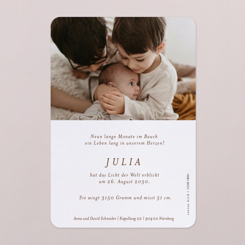 Schlicht und schön - diese große Geburtskarte im Hochformat hat sanft abgerundete Ecken und ist beidseitig personalisierbar.