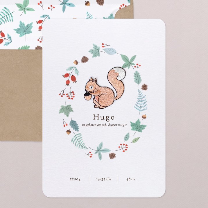 Wir freuen uns, Ihnen unsere Geburtskarten mit gesticktem Aufnäher zu präsentieren - eine originelle und exklusive Kreation aus unserem Atelier! Teilen Sie Ihr Glück auf die süßeste Art und Weise mit einer Karte, die mit einem niedlichen Accessoire in Form eines Kuscheltieres oder Waldtiers gespickt ist und einen Hauch von Retro-Feeling versprüht. Für Winterbabys haben unsere Designer dieses Modell in Winterfarben entworfen, das mit einem Kranz aus Ilex und anderen jahreszeitlichen Pflanzen geschmückt ist. In der Mitte der Karte schaut der gestickte Fuchs neugierig aus seinem Versteck, um Ihre freudigen Neuigkeiten mit Ihren Liebsten zu teilen.