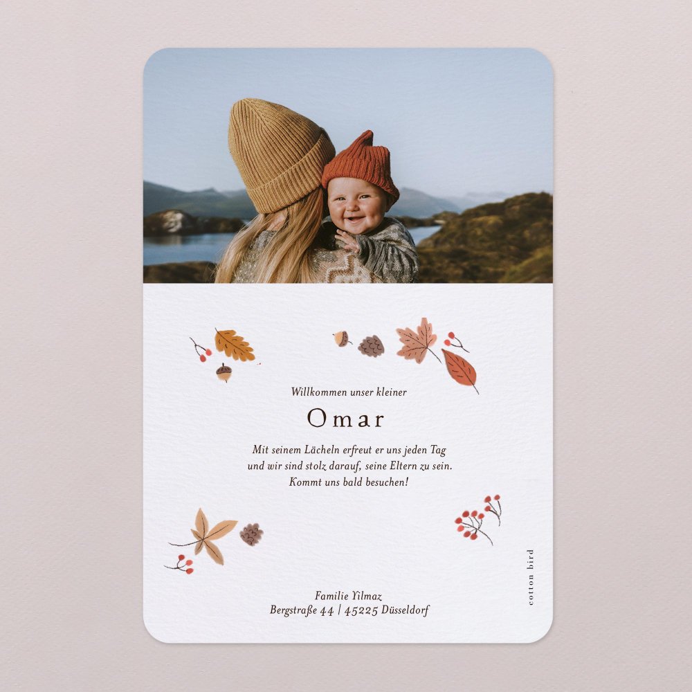 Wir freuen uns, Ihnen unsere Geburtskarten mit gesticktem Aufnäher zu präsentieren - eine originelle und exklusive Kreation aus unserem Atelier! Teilen Sie Ihr Glück auf die süßeste Art und Weise mit einer Karte, die mit einem niedlichen Accessoire in Form eines Kuscheltieres oder Waldtiers gespickt ist und einen Hauch von Retro-Feeling versprüht. Dieses Modell ist mit einem Kranz aus Herbstblättern in leuchtenden Orangetönen illustriert und ist ideal, um die Geburt Ihres Babys im Herbst anzukündigen. Der gestickte Fuchs verleiht der Geburtskarte zusätzlichen Charme. Ihre Liebsten werden begeistert sein!