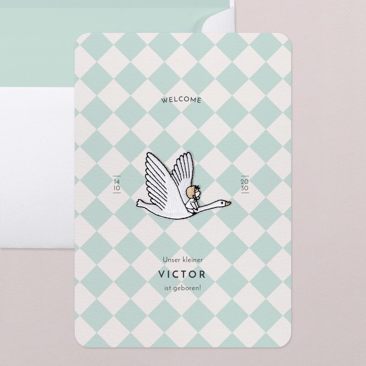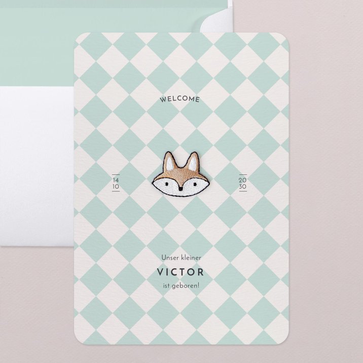 Wir freuen uns, Ihnen unsere Geburtskarten mit gesticktem Aufnäher zu präsentieren - eine originelle und exklusive Kreation aus unserem Atelier! Teilen Sie Ihr Glück auf die süßeste Art und Weise mit einer Karte, die mit einem niedlichen Accessoire in Form eines Kuscheltieres oder Waldtiers gespickt ist und einen Hauch von Retro-Feeling versprüht. Wählen Sie Ihren Lieblingsaufnäher, um eine einzigartige Geburtsanzeige für Ihre Tochter oder Ihren Sohn zu gestalten. Die originelle Geburtskarte Harlekin Grün hat ein verspieltes Rauten-Design in zartem Grünton. Die Karte können Sie sowohl zur Geburt eines Mädchens als auch eines Jungen selbst online gestalten und als Überraschung an Ihre Familie und Freunde versenden.
