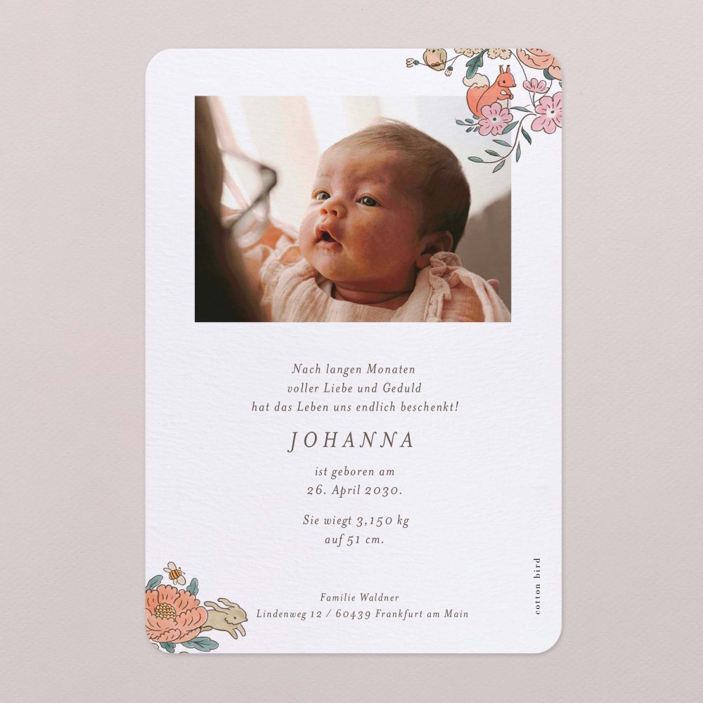 Auf der Geburtskarte Scarlett spielen Eichhörnchen, Hase und Vogel Verstecken inmitten eines bezaubernden Blumenmotivs in Orange- und Rosatönen. Eine fröhlich-bohème Kreation, ideal für eine Frühlings- oder Sommergeburt.
