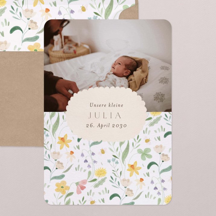 Narzissen, Veilchen, Löwenzahn und andere bunte Blumen schmücken die Geburtskarte Lilly Rose. Frisch und frühlingshaft wird dieses bezaubernde Motiv mit niedlichen Bienen die Ankunft Ihres kleinen Mädchens oder Jungen perfekt verkünden.