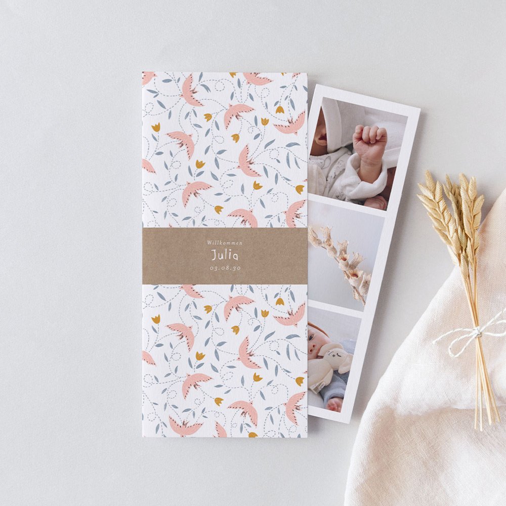 Mit sommerlichen Farben ist die Geburtskarte Sommerwind I ideal, um die Geburt Ihres Babys frisch und fröhlich anzukündigen. Blumen, Vögel und zart skizzierte Symbole vereinen sich zu einem wundervollen Design, das Ihre Liebsten sicher begeistern wird!