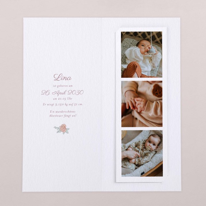 Das besondere Format dieser Geburtskarte wird Ihre Liebsten begeistern! Dieses Modell besteht aus einer hochformatige Klappkarte und einem herausnehmbaren Fotostreifen, der als Andenken aufbewahrt, an den Kühlschrank gepinnt oder als Lesezeichen benutzt werden kann.