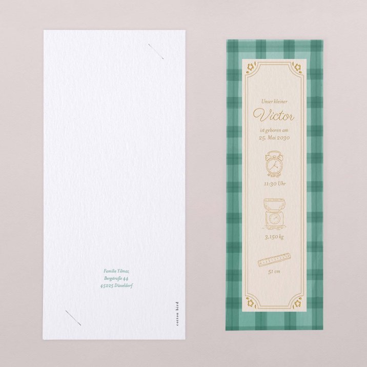 Elegant und zeitlos – das Tartanmuster verleiht der Geburtskarte Green Tartan eine stilvolle Note. Mit ihren grünen Farbtönen und den zarten goldenen Veredelungen ist diese Karte die perfekte Wahl, um die Geburt Ihres Kindes mit schlichter Eleganz zu verkünden. - Farbe: Grün, Gold - Thema: Originell, chic - Illustrationen: Blume, Tartanmuster - Veredelungen: Gold