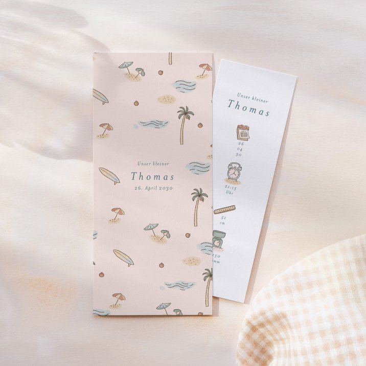 Mit ihren sommerlichen Mustern und Farben erinnert die Geburtskarte Aloha an lange Sommertage und entspannte Stunden am Meer. Diese originelle Kreation verkündet die Geburt Ihres kleinen Glücks mit sanfter Wärme. - Farbe: Beige, Blau, Grün - Thema: Originell, Meer, maritim - Illustrationen: Sonnenschirm, Meer, Surfbrett, Orangen