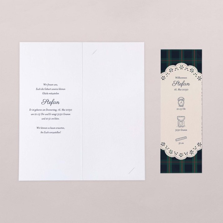 Als Hommage an den ikonischen Claudine-Kragen wurde die Geburtskarte Claudine – Tartan entworfen, um die Geburt Ihres Babys auf originelle Weise zu verkünden. Das klassische Tartan-Muster verleiht diesem zarten Design grafische Tiefe und sanfte Wärme. – Farbe: grün, blau, braun, beige – Thema: elegant, originell – Illustrationen: Claudine-Kragen, Kleidung, Knöpfe