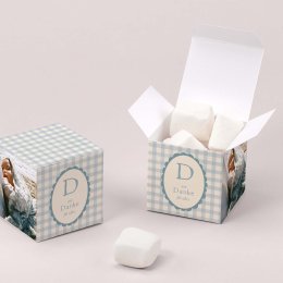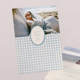 Mit seinem charakteristischen Vichy-Muster erzählt die Geburtskarte Vichy – blau zart und liebevoll von der Ankunft Ihres Neugeborenen, in einer Komposition aus sanften Blautönen. – Farbe: blau, beige – Thema: originell, farbenfroh – Illustrationen: Vichy-Muster