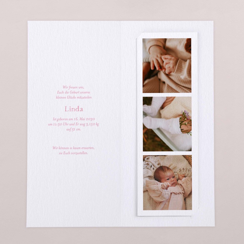 Das besondere Format dieser Geburtskarte wird Ihre Liebsten begeistern! Dieses Modell besteht aus einer hochformatige Klappkarte und einem herausnehmbaren Fotostreifen, der als Andenken aufbewahrt, an den Kühlschrank gepinnt oder als Lesezeichen benutzt werden kann.
