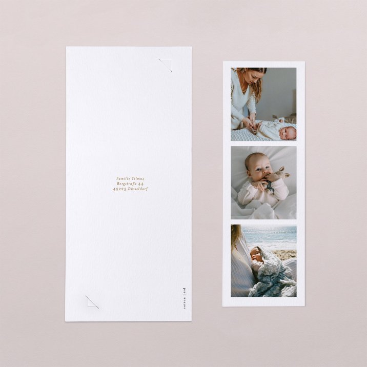 Diese Geburtskarte besteht aus einer Klappkarte im Hochformat und einem herausnehmbaren Fotostreifen mit Platz für 3 Ihrer schönsten Fotos. Der Streifen kann als Andenken in der Karte aufbewahrt werden, aber auch herausgenommen und an den Kühlschrank gepinnt oder als Lesezeichen genutzt werden.