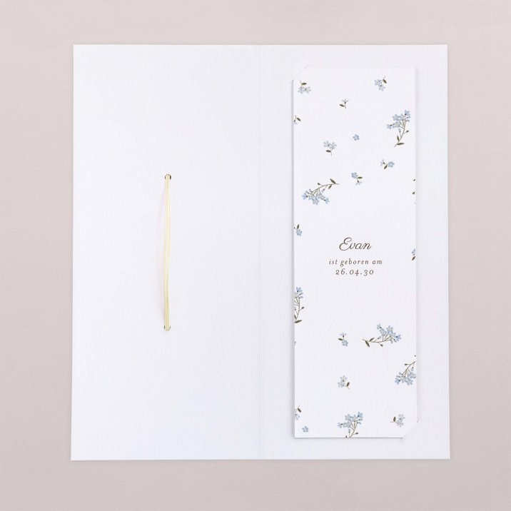Eine zarte Reihe blauer Vergissmeinnicht schmückt die gestreifte Geburtskarte Myosotis. Eine poetische Kreation voller Sanftheit, perfekt für die liebevolle Ankündigung der Geburt Ihres Babys im Frühling oder Sommer.