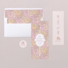 Mit sanften Pastelltönen in Rosa, Orange und Gelb teilt die Geburtskarte Allegria die Ankunft Ihres Kindes mit fröhlicher Poesie – ideal für eine Frühlingsgeburt.