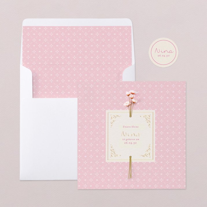 Eine Symphonie aus zarten pastellrosa Motiven und goldenen Verzierungen findet sich auf der Geburtskarte Kleines Balett. Diese einzigartige Kreation ist perfekt, um die Ankunft Ihrer kleinen Prinzessin anzukündigen.