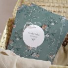 Die Geburtskarte besteht aus einer quadratischen Klappkarte und einem runden Anhänger. Gestalten Sie die Karte auf der Vorder- und Rückseite mit Ihren Fotos und Ihrem Text. Auch der kleine Anhänger lässt sich personalisieren.