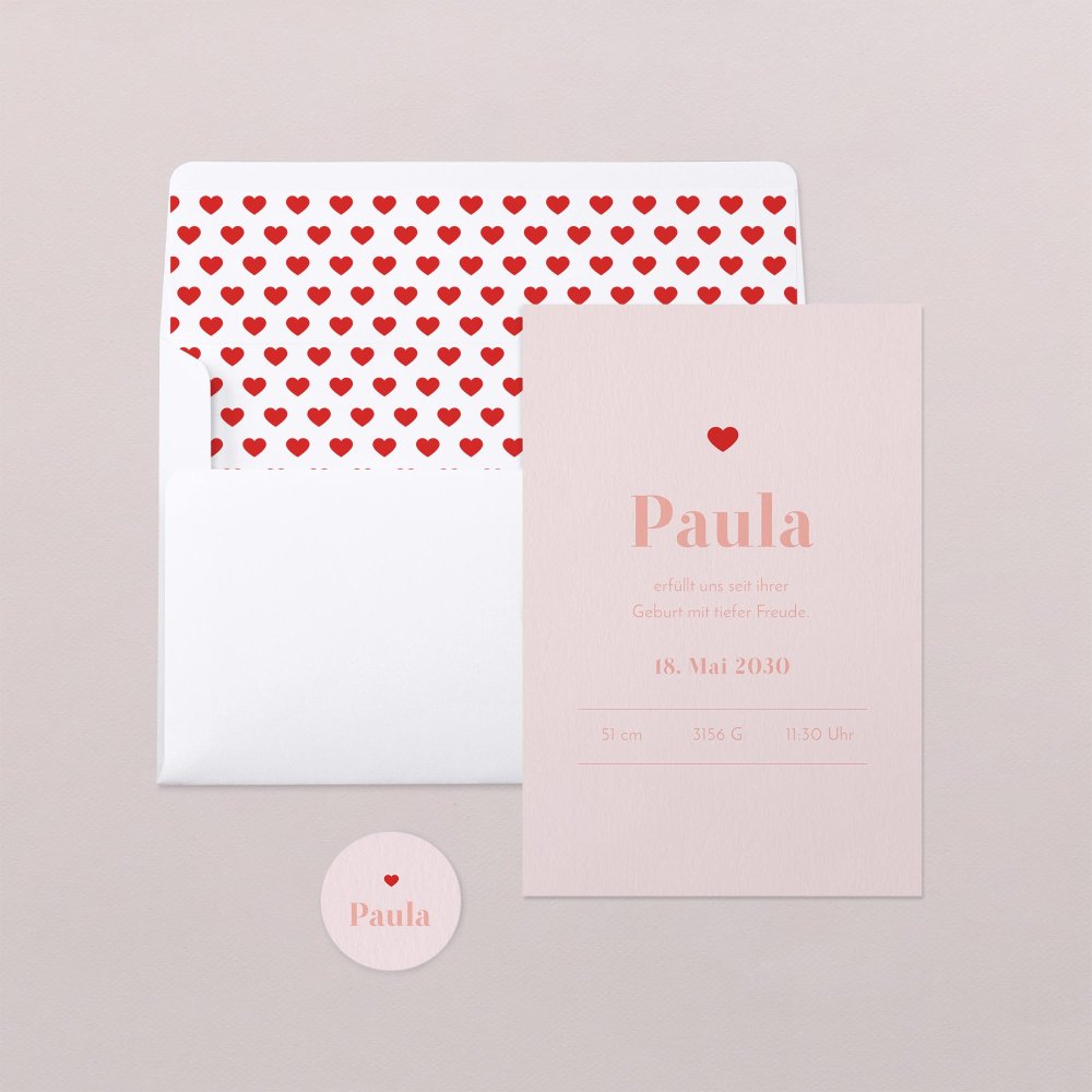 Auf der Geburtsanzeige Kleines Herz II untermalen sanfte Rosatöne und ein kleines Herzchen die Ankündigung Ihres Glücks. Ein schlichtes Design, das Ihre Familie und Freunde lieben werden!