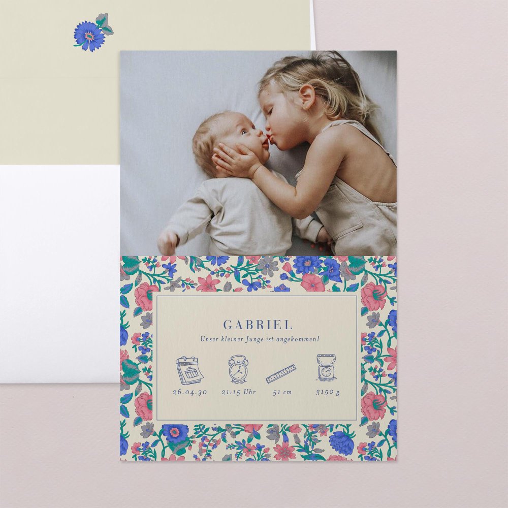 Feiern Sie die Ankunft Ihres Kindes mit der Geburtsanzeige Siloé. Zarte Aquarell-Blumenmotive in sanften Rosa-, Blau- und Grüntönen sind auf dieser Geburtskarte zu sehen und kündigen Ihr Glück sanft an.