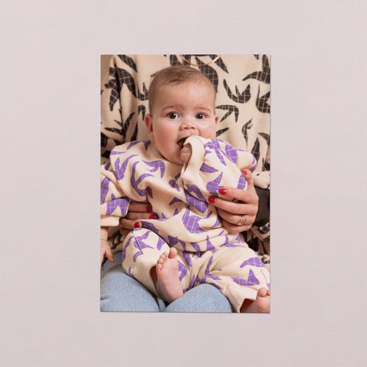 Kündigen Sie die Ankunft Ihres Babys mit der Geburtskarte Purple Gang an. Auf einem sanften, lilafarbenen Hintergrund sind niedliche Welpen abgebildet, die von dem berühmten Gamin Gamine-Motiv inspiriert sind und Ihrer Ankündigung Charme und Kreativität verleihen.