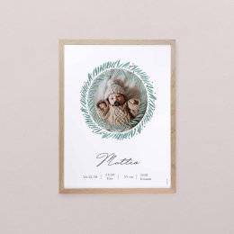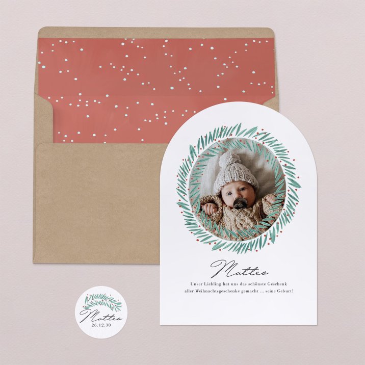 Auf der Geburtkarte Holy crown umrahmt ein winterlicher Kranz das Foto Ihres Kindes. Das moderne und elegante Design überbringt Ihre Babynews auf schönste und zur Jahreszeit passende Weise.