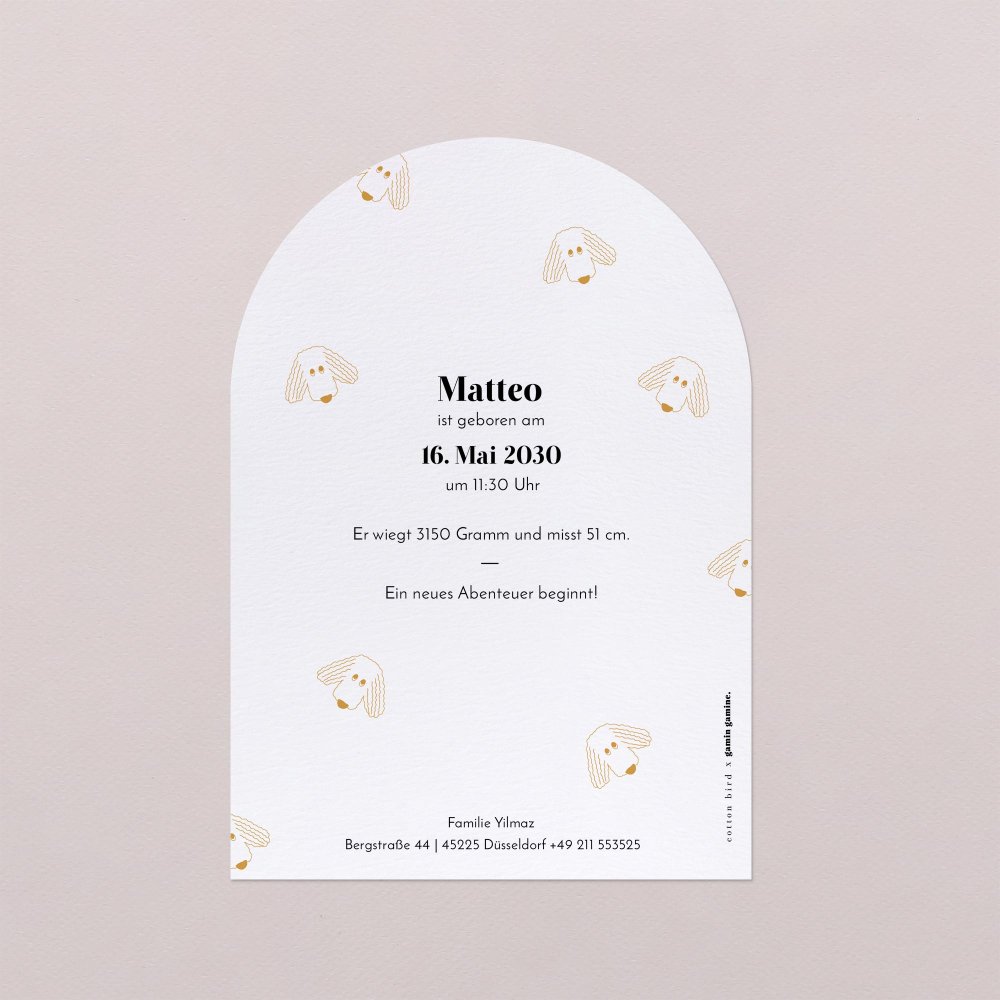 Diese halbrunde Geburtskarte mit bogenförmiger Oberkante kann auf der Vorder- und Rückseite mit Infos rund um die Geburt Ihres Babys personalisiert werden.