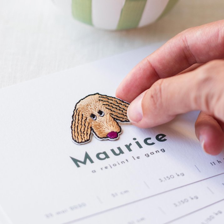 Auf der Geburtskarte Match & Patch I verleiht ein gestickter Welpe in Haselnuss Ihrer frohen Botschaft einen zusätzlichen Charme. Dieses schlichte Design vereint Zartheit und Originalität und ist ideal, um die Ankunft Ihres süßen Babys zu feiern.