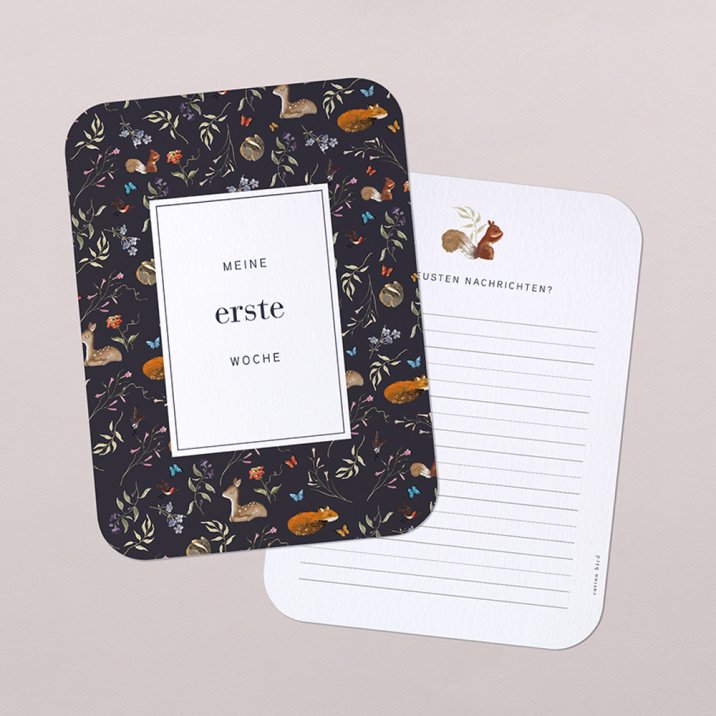 Das Meilensteinkarten Set besteht aus einem hübschen Etui mit 15 Karten (von 1 Woche bis 12 Monate), die auf der Vorderseite illustriert sind und auf der Rückseite Platz für Ihre Notizen bieten, um die Entwicklung und Erlebnisse Ihres Babys festzuhalten.