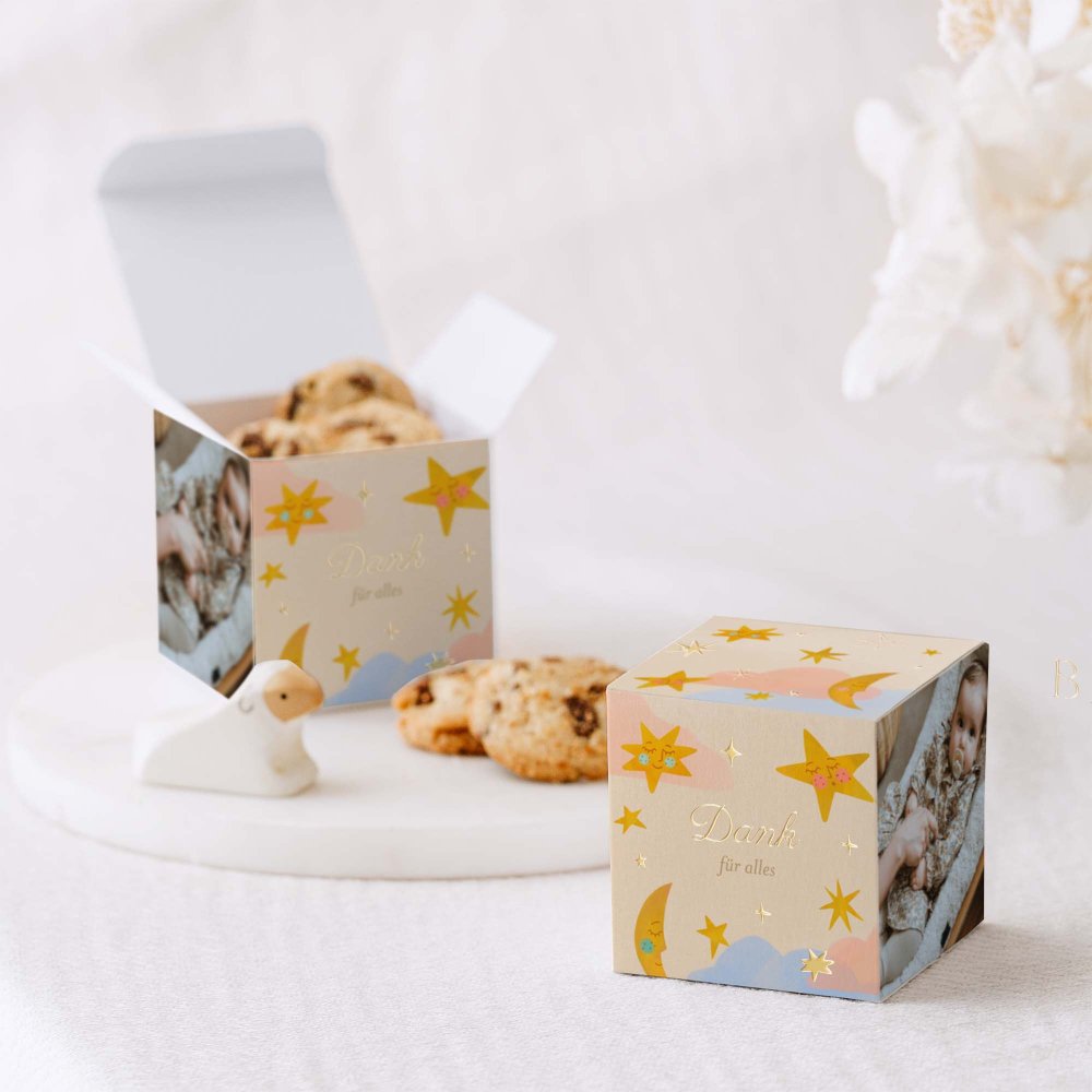 – Farbe: gelb, blau, rosa, gold, beige – Thema: elegant, originell, Himmelskörper – Illustrationen: Sterne, Mond, Wolken