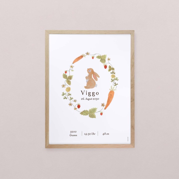 Dekoratives Poster mit Illustration und den wichtigsten Details zur Geburt: Name, Gewicht, Größe des Babys sowie Datum und Uhrzeit!